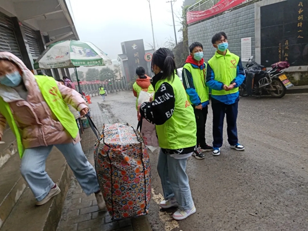 桐梓中学的志愿者们化身“搬运工”,为全校师生帮助搬运行李。尽管下着小雨,同学们仍旧在寒风中从早上8点坚持服务到下午3点。