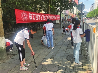 9月底,区实验小学的20余名学生及家长戴上了小红帽、红袖章,拿着撮箕、扫帚、抹布等工具,顶着烈日来到城区各主干道,与环卫工人一起打扫卫生,开展“小手拉大手,共建文明城”活动。